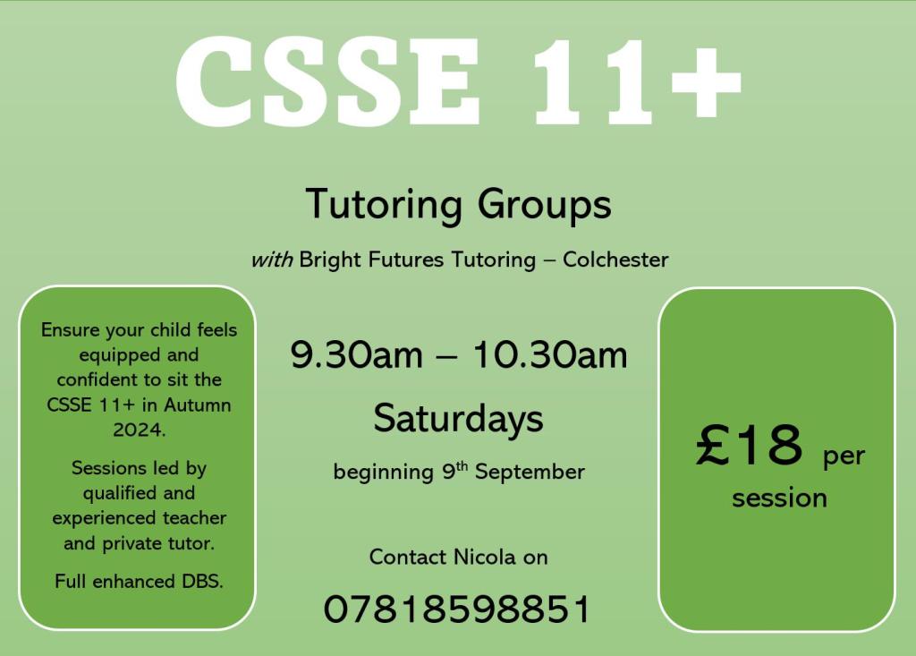 In Colchester, the two grammar schools are Colchester Royal Grammar School for boys and Colchester County High School for girls. Both are members of the Consortium of Selective School in Essex (C.S.S.E.). It is very important to note when hiring a tutor or buying revision guides that your child will be sitting the CSSE 11+. Other selective schools in other parts of the country set different 11+ exams, GL or CEM for example, so ensure that you prepare for the right test!